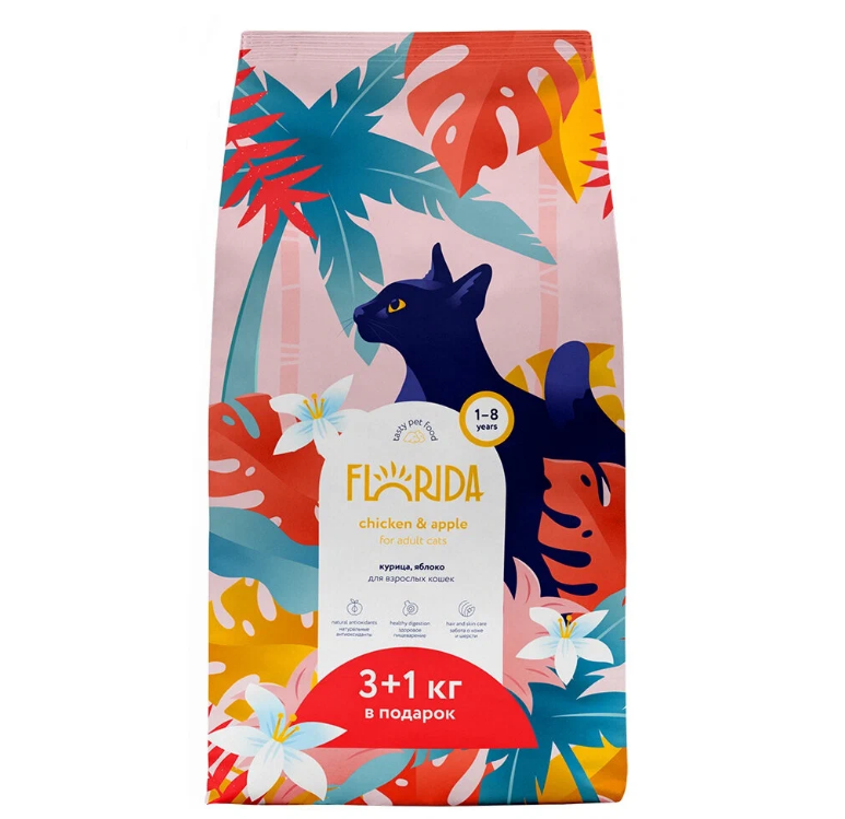 FLORIDA для взрослых кошек с курицей и яблоком (3 + 1 кг)