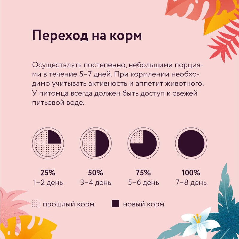 | Дополнительная информация | Переход с предыдущего рациона осуществлять постепенно, небольшими порциями в течение 5-7 дней. При кормлении необходимо учитывать активность и аппетит животного. Корм должен быть комнатной температуры. Содержимое открытой упаковки хранить при температуре +5°С и использовать в течение 2 дней. У кошки всегда должен быть доступ к свежей питьевой воде. |