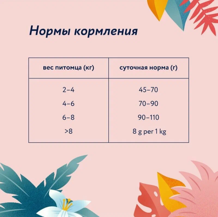 | Минеральные вещества | кальций 1,1%, фосфор 0,9%, медь 12 мг/кг, цинк 130 мг/кг, железо 100 мг/кг, марганец 40 мг/кг, йод 2 мг/кг, таурин 1500 мг/кг |