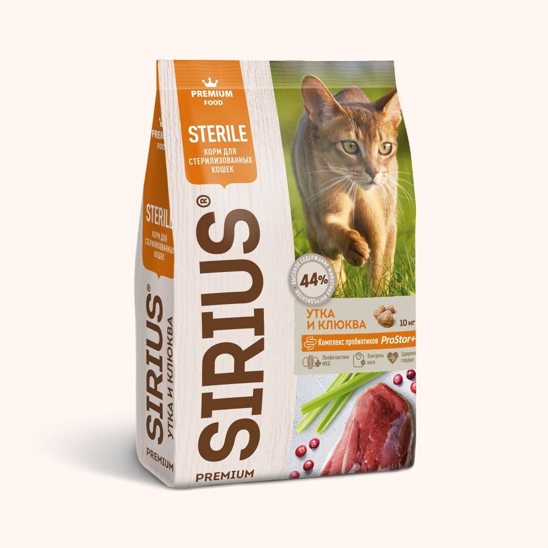 SIRIUS/Полнорационный сухой PREMIUM корм для стерилизованных кошек, Утка и клюква, 0.4 кг