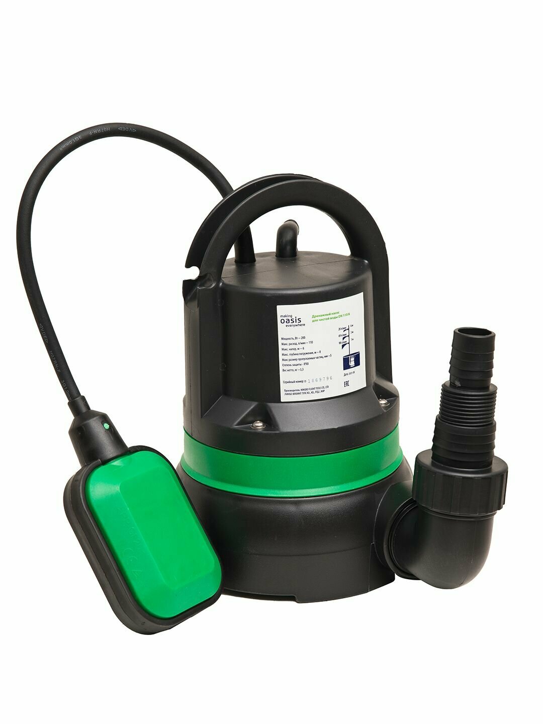 Насос дренажный, Oasis, 10 м, 200 Вт, глубина погружения 8 м, максимальный напор 6 м, 6.6 м3/час, DN 110/6