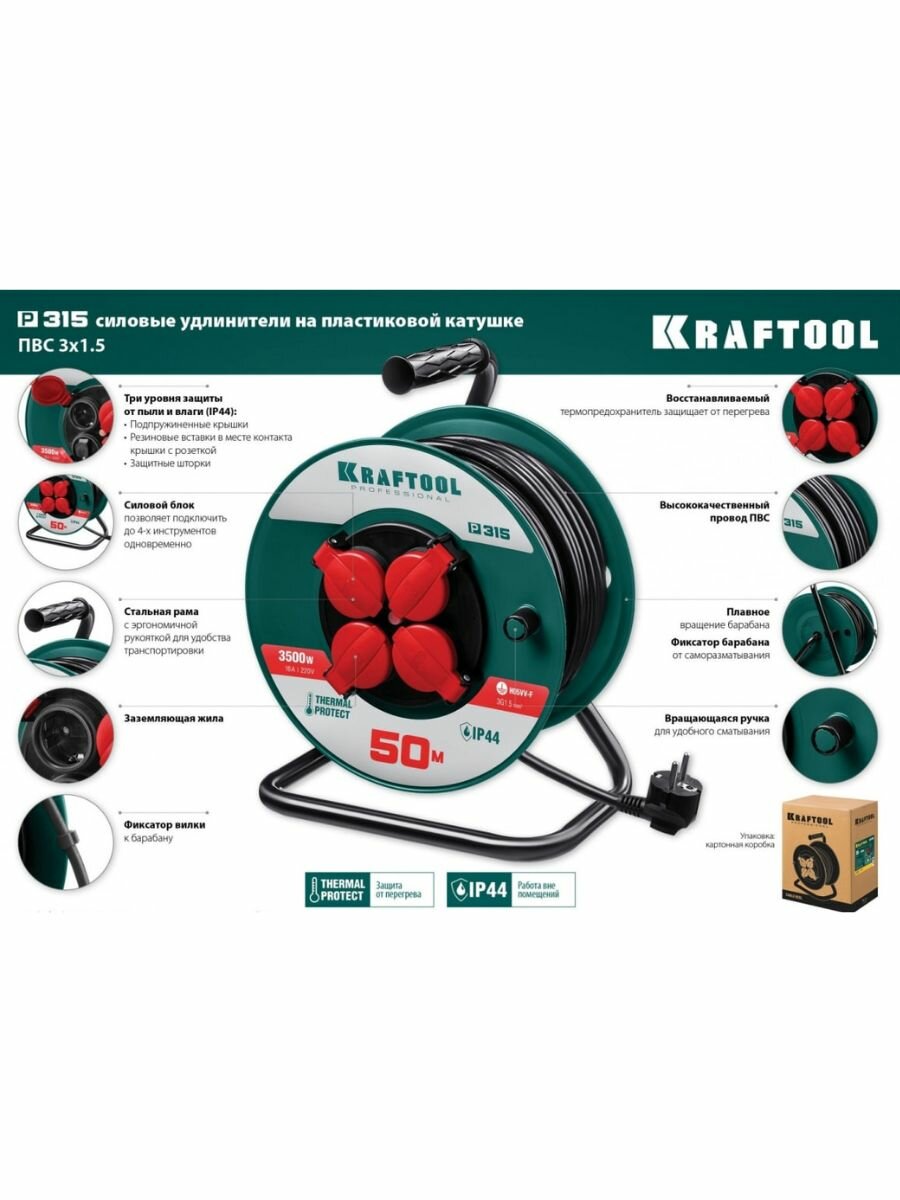 Силовой удлинитель на катушке KRAFTOOL ПВС 3х1.5 30м, 3500Вт IP44, P-315