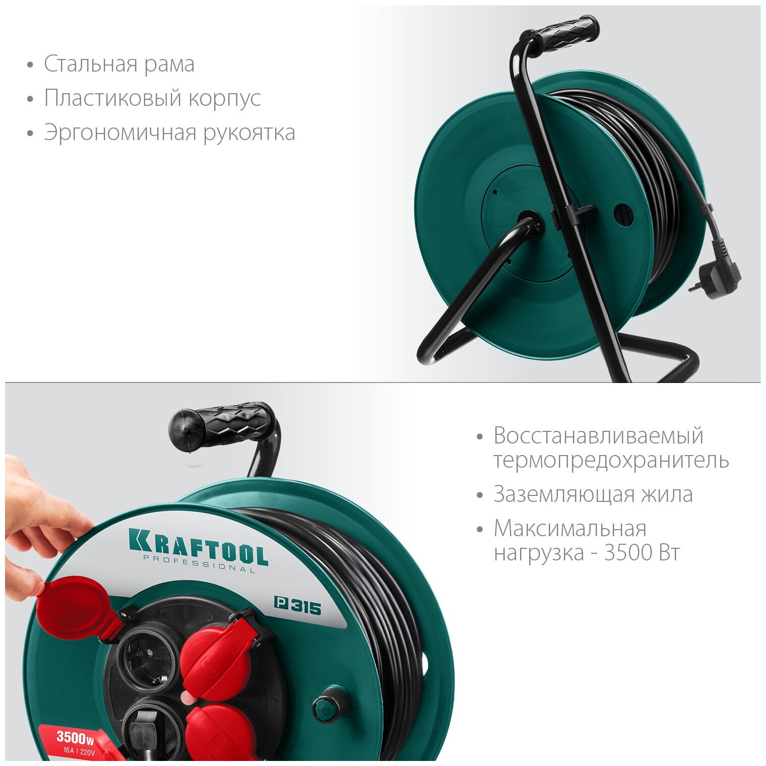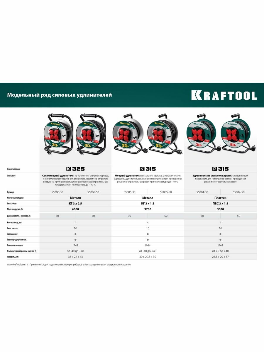 KRAFTOOL P-315, ПВС 3х1.5 30м, 3500Вт IP44, Силовой удлинитель на катушке (55084-30)