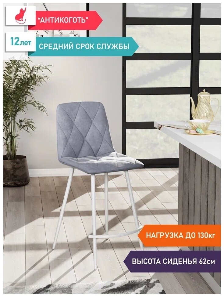 Купить Стул полубарный Ричи, СтолБери, велюр серый, каркас белый, антикоготь, 1 шт.