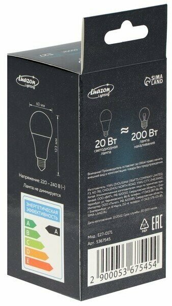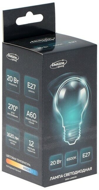 Лампа cветодиодная Luazon Lighting, A60, 20 Вт, E27, 1620 Лм, 6500 К, холодный белый 5367545