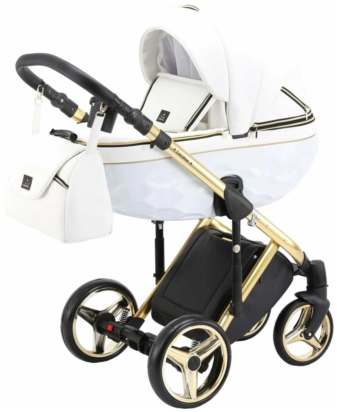 Коляска для новорожденных 2 в 1 Adamex Chantal Se Deluxe, прогулочная универсальная белая эко-кожа с золотой рамой интересное: