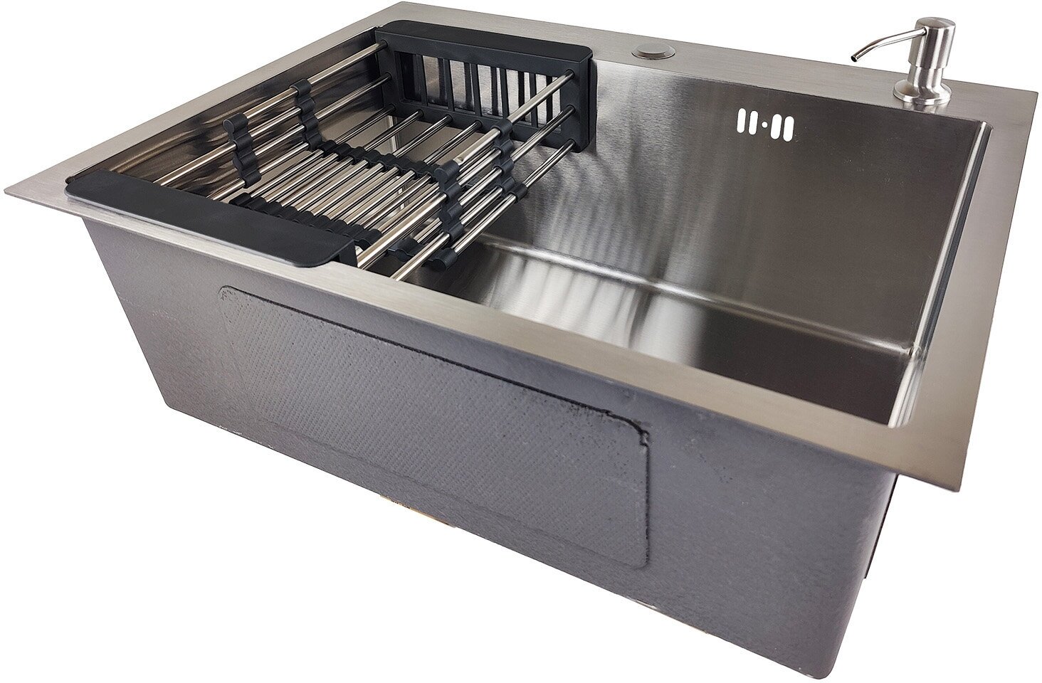 Стильно смотрится. Удобный дозатор для мыла в комплекте. Корзина для сушки посуды и овощей ?? Царапин не остается. Не шумит.