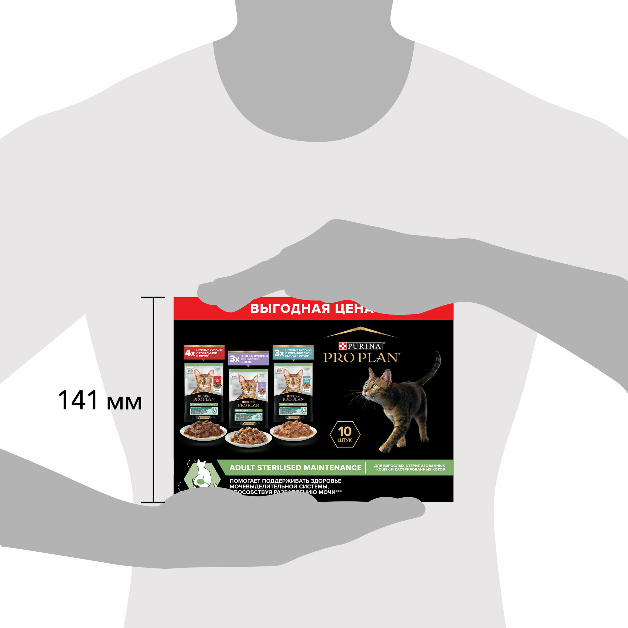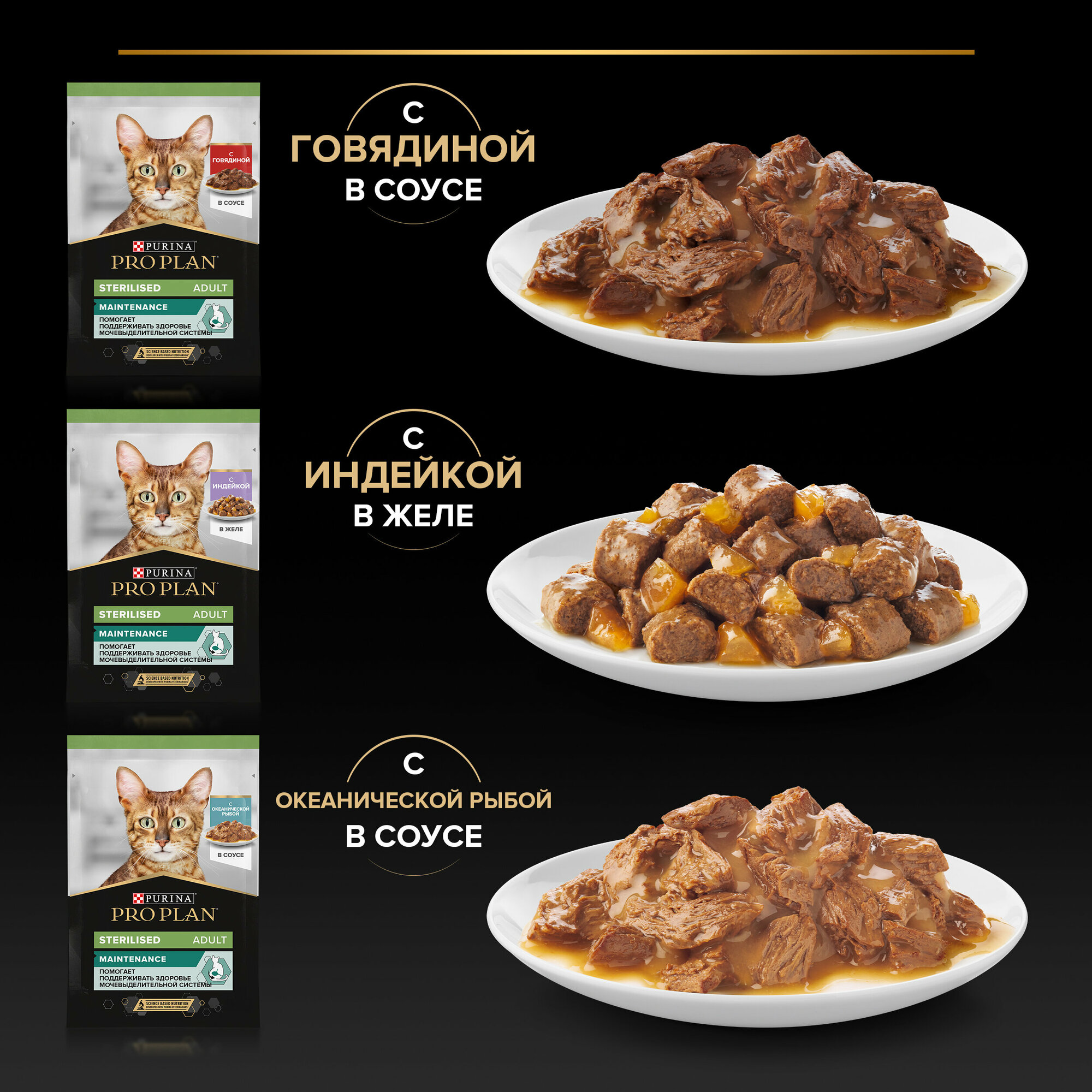 Купить Промопак: Влажный корм Pro Plan для стерилизованных кошек ( говядина в соусе 4шт, индейка в желе 3шт, рыба в соусе 3шт) 850гр