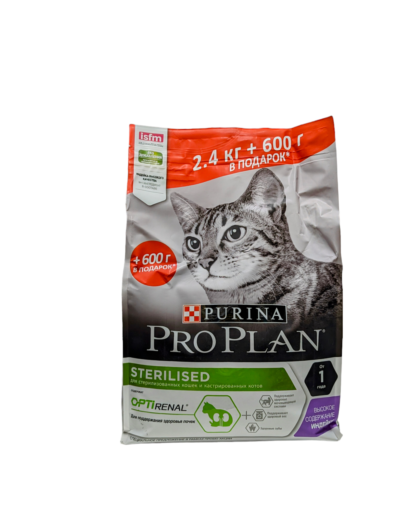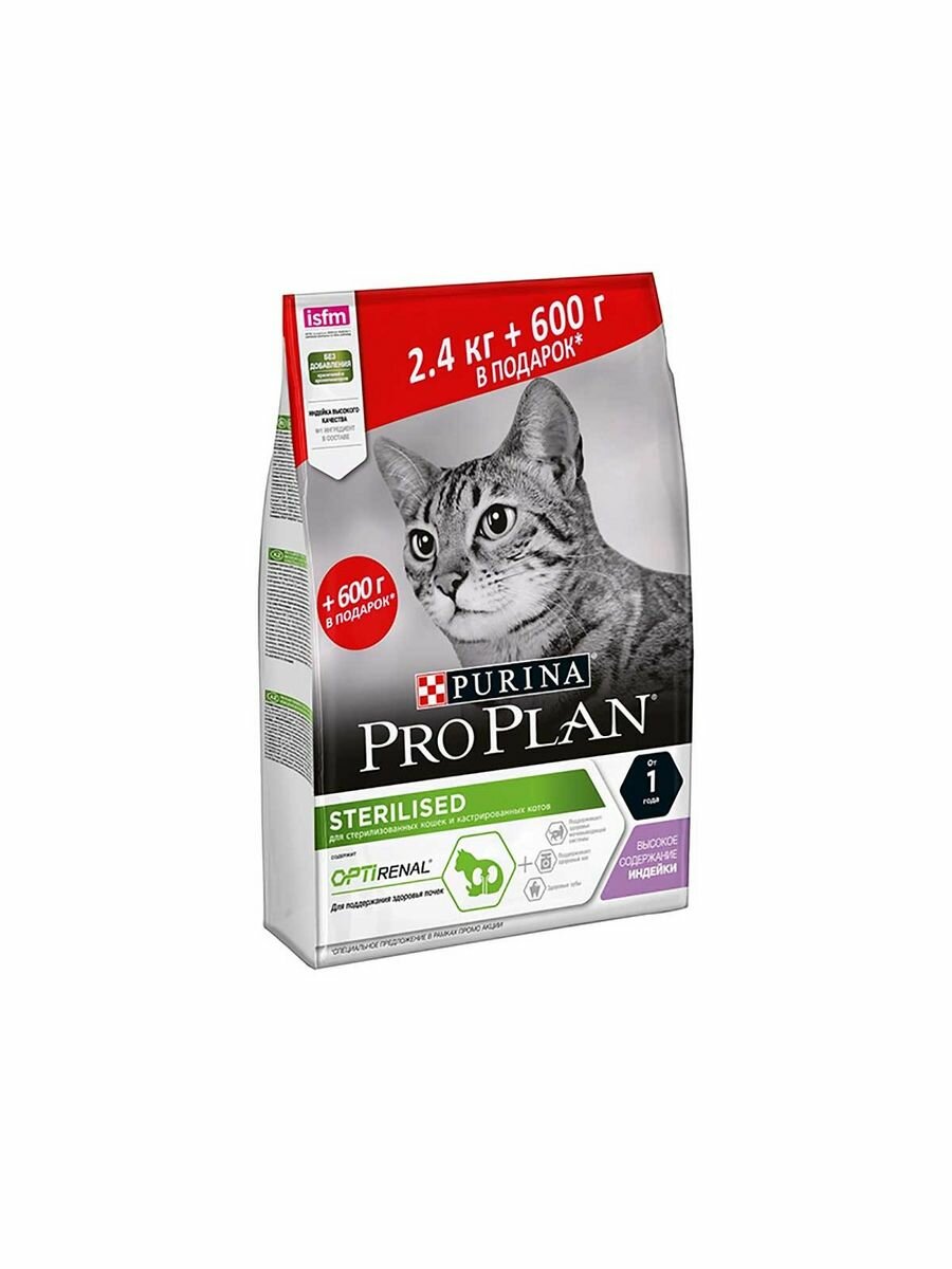Корм PRO PLAN Sterilised OPTI RENAL (комплекс для поддержания здоровья почек) для стерилизованных кошек, с индейкой, 2.4 кг +600г