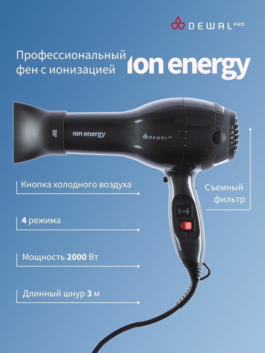 Dewal Professional ION ENERGY - Деваль Ион Энерджи фен, тёмно-серый, вес 650 г., 2000 Вт., 3-8800 Grey -