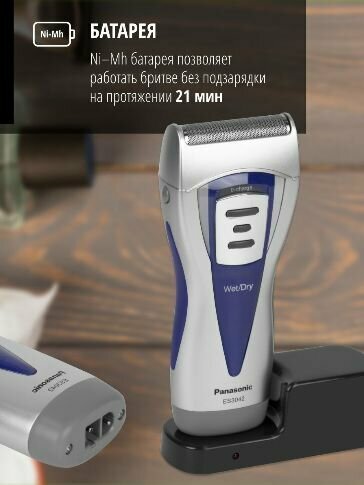 Бритва Panasonic ES-3042-S520, сеточная, влажное бр, аккум на 21 мин, 1 плавающая головка, триммер, серебристый/синий