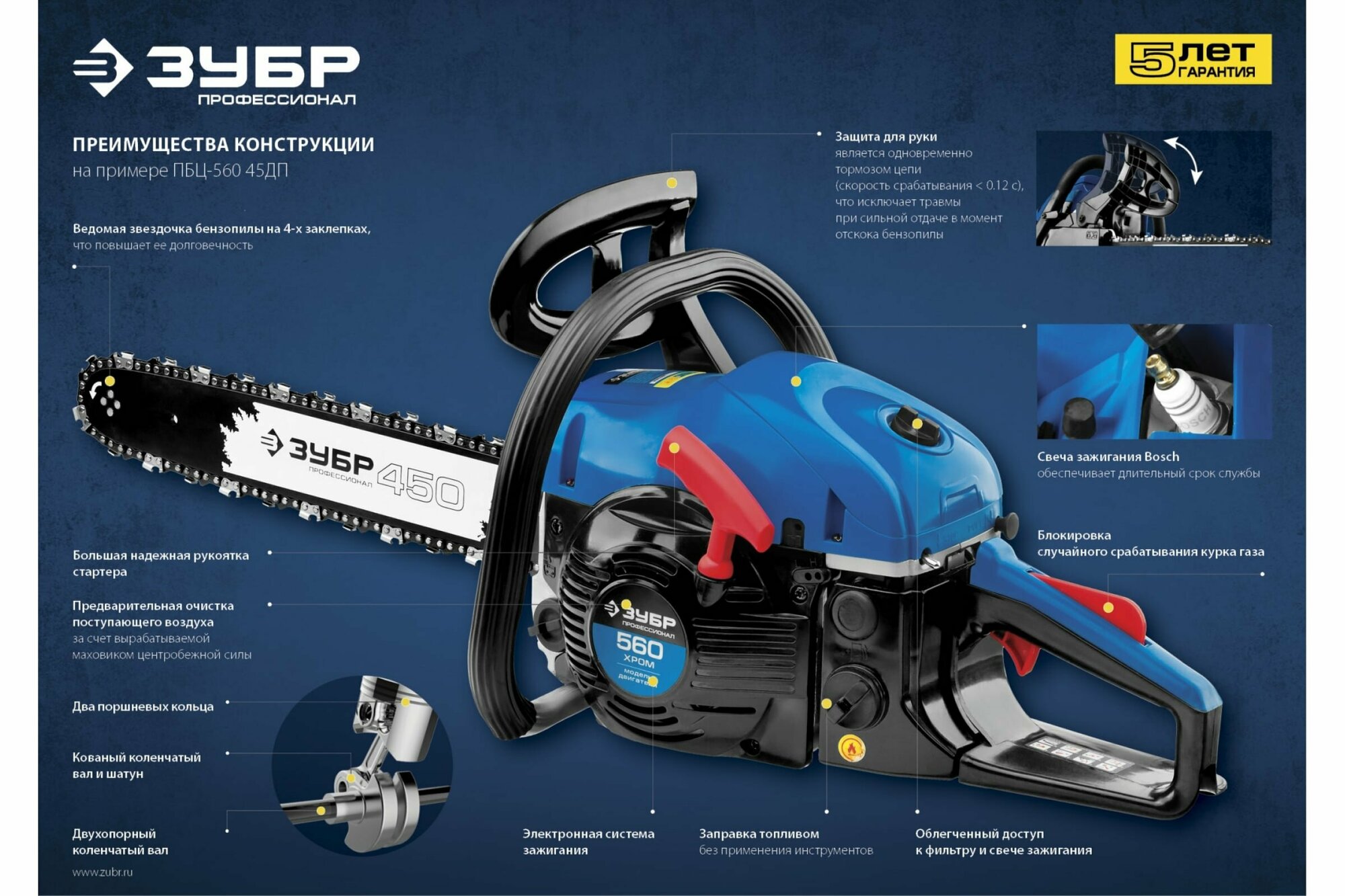 Бензопила зубр пбц-560 45дп, 56 см3, 45 см