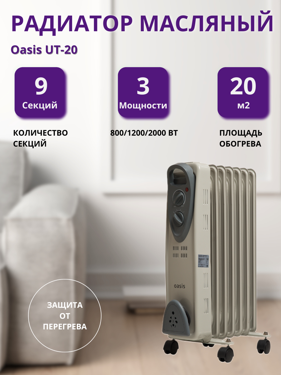Обогреватель масляный Оазис UT-20, 2000Вт, 9 секций