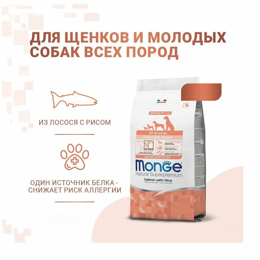 Сухой корм для щенков Monge Speciality line ALL BREEDS PUPPY & JUNIOR SALMONE AND RICE, лосось, с рисом, 2 шт х 2.5 кг интересное: