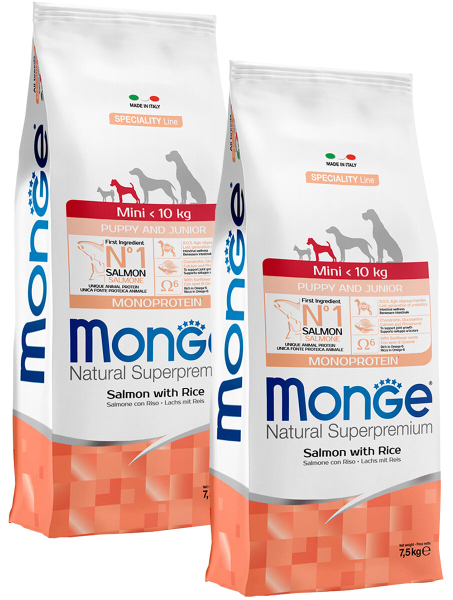 Купить MONGE SPECIALITY MONOPROTEIN MINI PUPPY & JUNIOR SALMON монобелковый для щенков маленьких пород с лососем и рисом (7,5 + 7,5 кг)