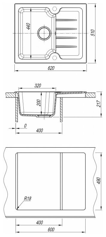 Мойка для кухни врезная каменная Dr. Gans ЛОРА-620, цвет черный, с крылом, прямоугольная, 620х510х217 мм