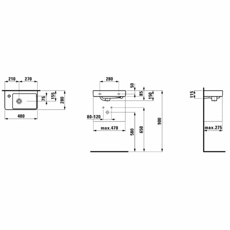 Laufen Pro S Раковина 48х28х85 мм,подвесная/на столешницу, левая, с 1 отв. под смеситель, c переливом, цвет: белый