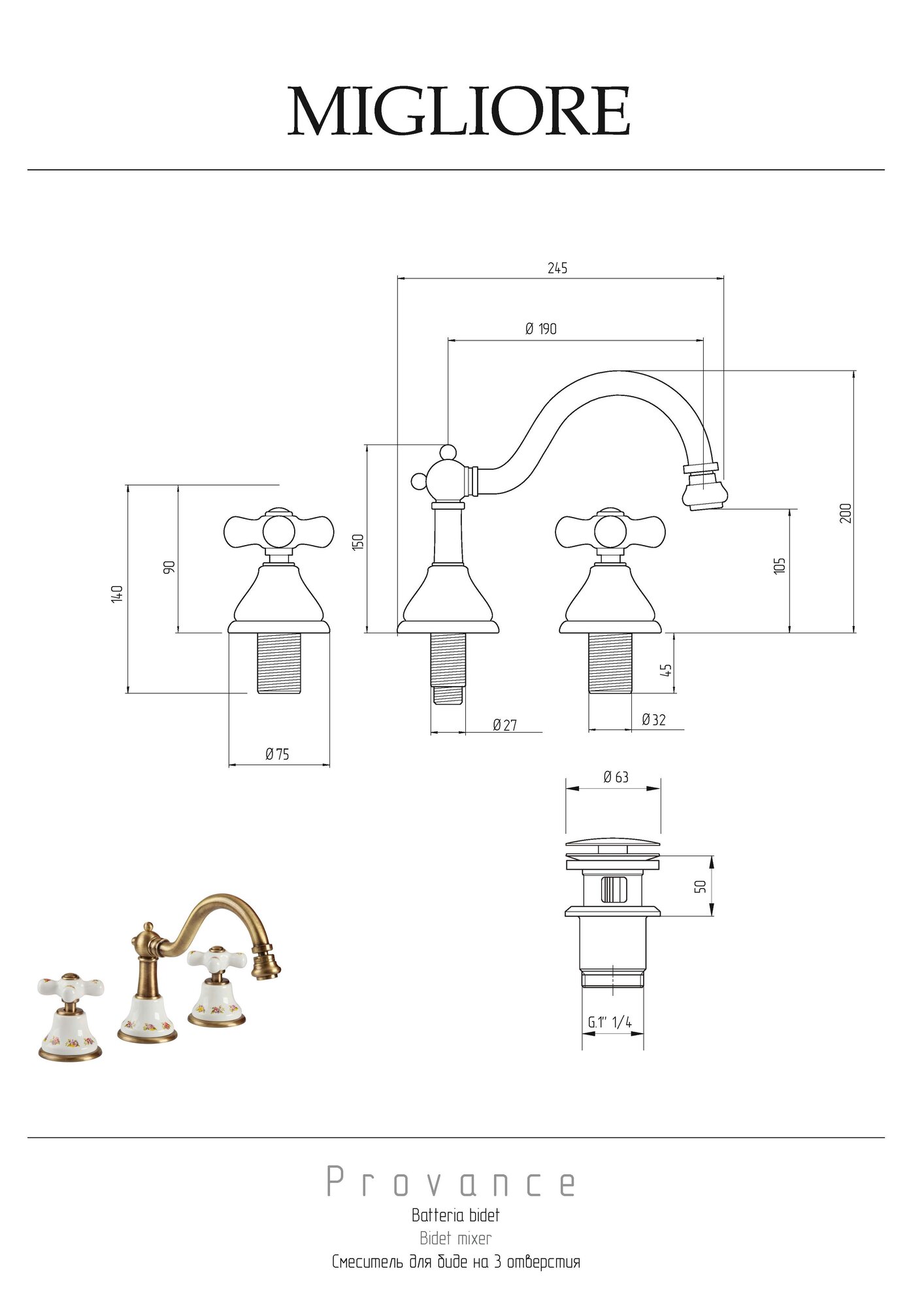 Migliore Смеситель Provance 19477 для биде на 3 отверстия, золото