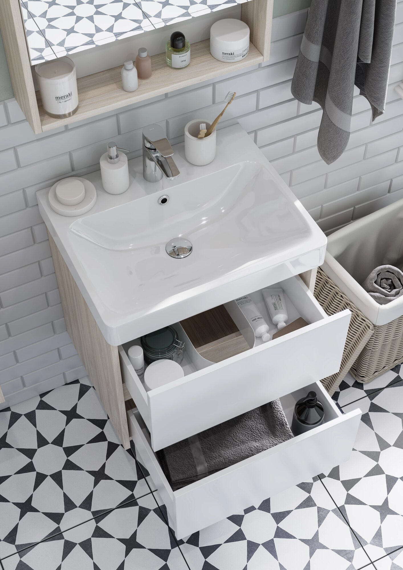 Тумба с раковиной для ванной с выдвижными ящиками AQUATON 1A1959K1VDAV0 Верди 50 белый/ясень фабрик, раковина Нео 50
