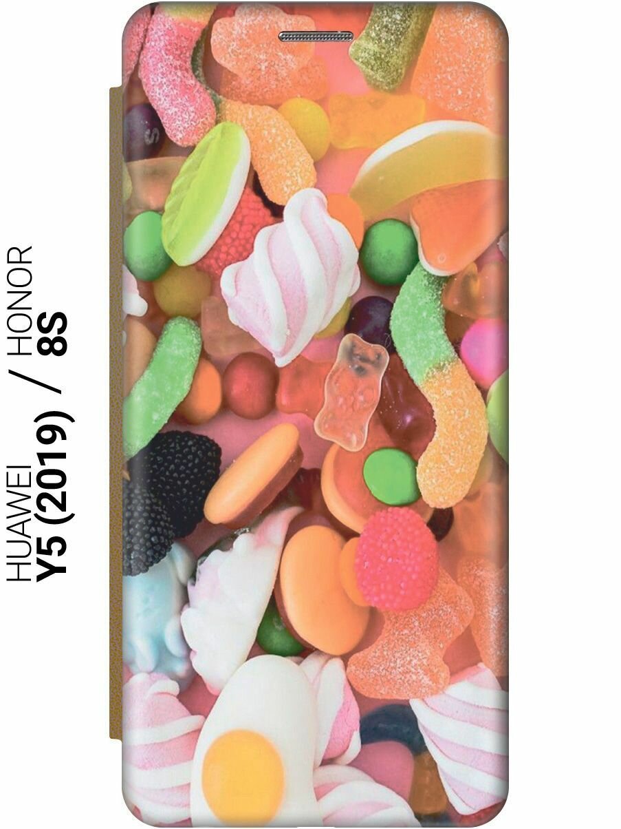 Чехол-книжка на Honor 8S, Huawei Y5 (2019), Хуавей У5 2019, Хонор 8с c принтом "Мешок сладостей" золотистый