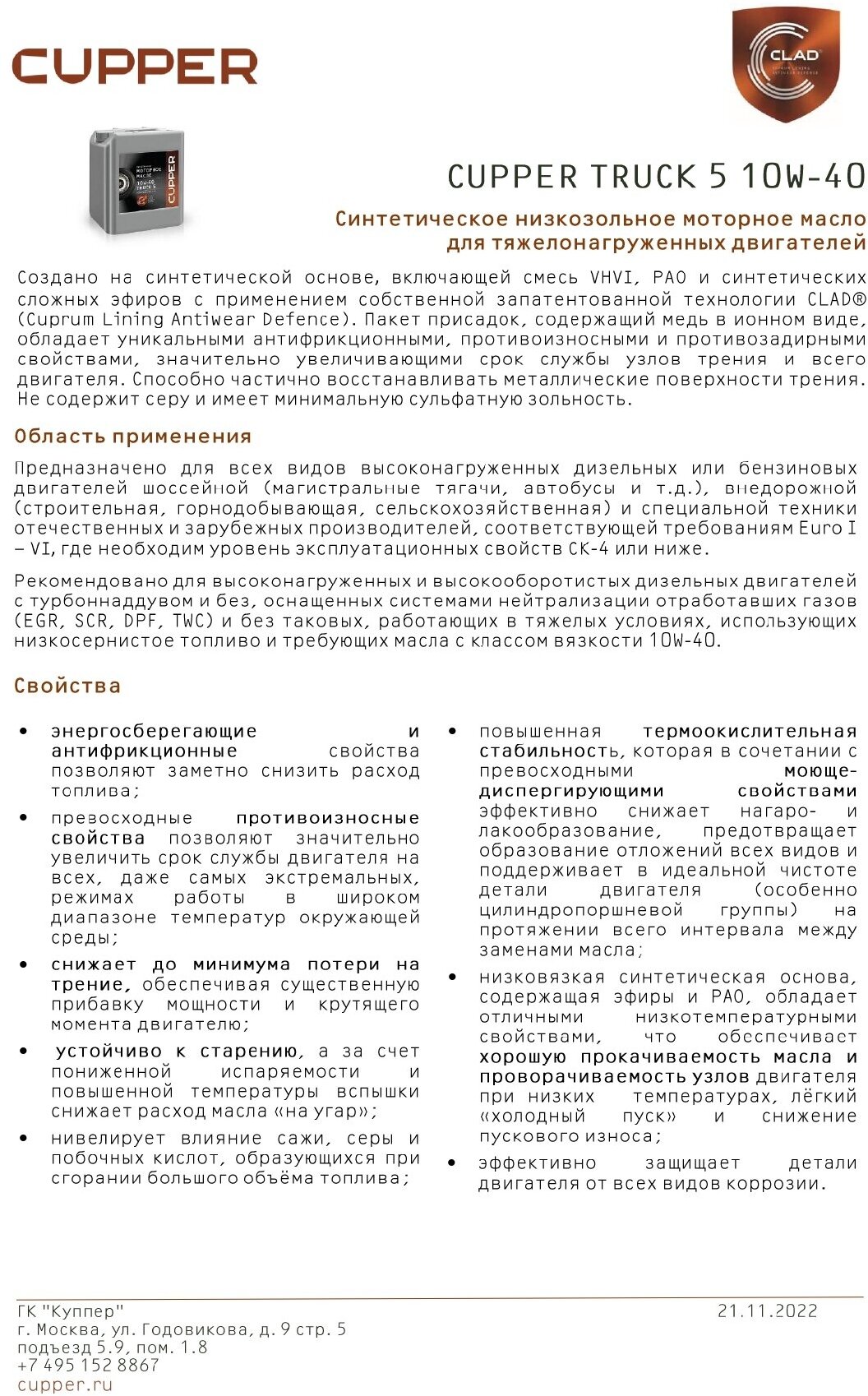 Масло моторное CUPPER SE 10W40 TRUCK5 (10л) интересное: