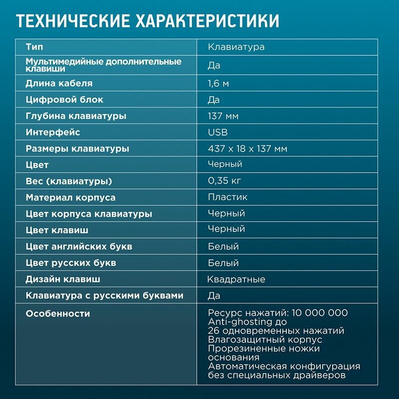 | Плюсы: | 15 кнопок с управлением мультимедийными функциями, большой ресурс нажатий, 1.6 метров usb кабель. |