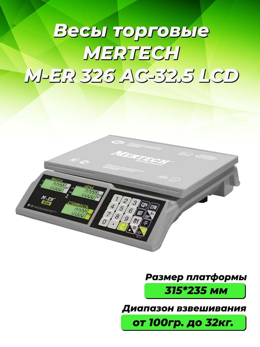 Весы торговые MERTECH M-ER 326AC-32.5 LCD (0,1-32 кг), дискретность 10 г, платформа 325x230 мм, без стойки, 3041 - 1 шт.