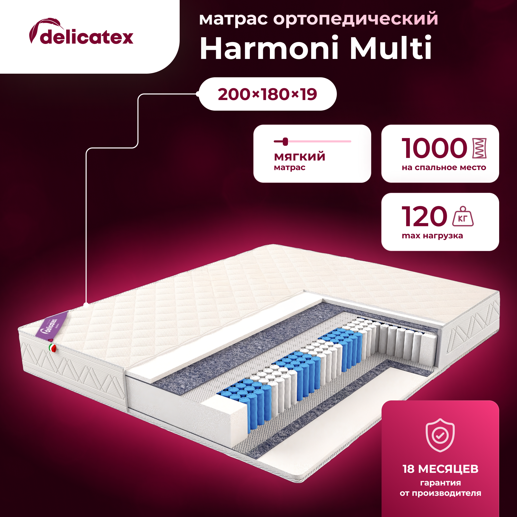 Купить Матрас пружинный Delicatex Harmoni multi, мягкий, 180x200х19 см, ролл в скрутке