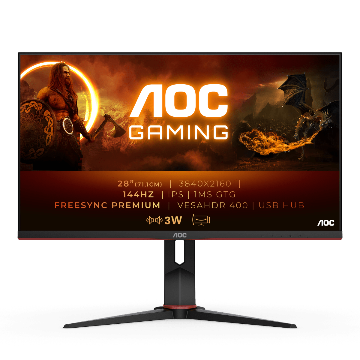 Купить AOC Монитор LCD 28'' [16:9] 3840x2160(UHD 4K) IPS, nonGLARE, 370 cd/m?, H178°/V178°, 1000:1, 80M:1, 16.7M, 1ms, VGA, 2xHDMI, 2xDP, USB-Hub, Height adj, Tilt, Swivel, Speakers, Audio out, 3Y, Black-Red