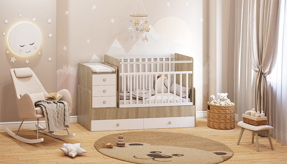 - Красивый дизайн, - Маятник, - Наличие пеленального столика и много шкафчиков, - Трансформер - может стать кроватью для ребёнка старшего возраста. |
