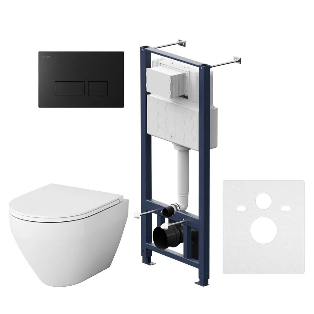 Инсталляция с подвесным унитазом AM.PM Venus DX16.IS20138.1700, унитаз подвесной безободковый с инсталляцией, комплект 6 в 1 с сиденьем микролифт, пневматическая клавиша Square черная матовая, шумоизоляция, крепления, Германия