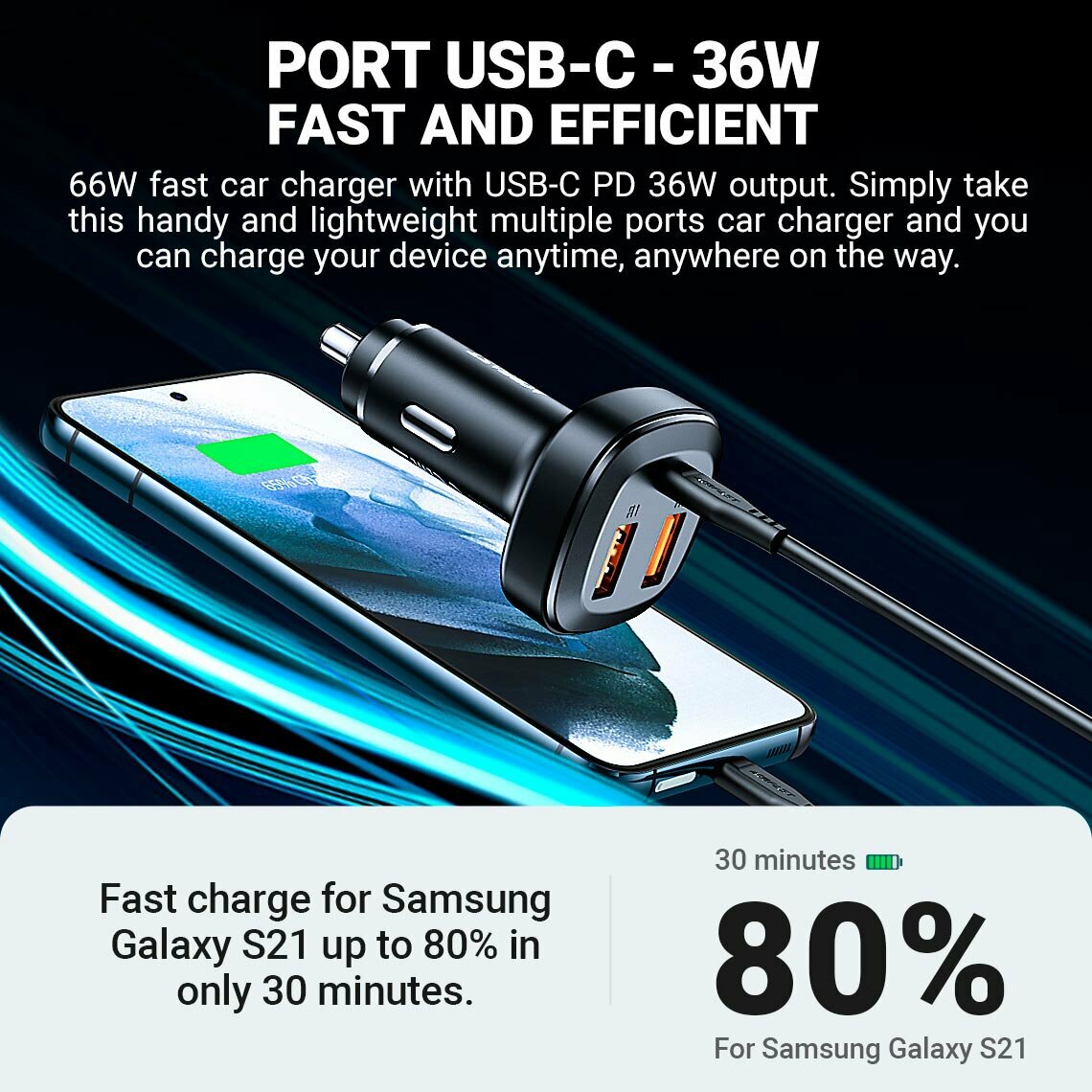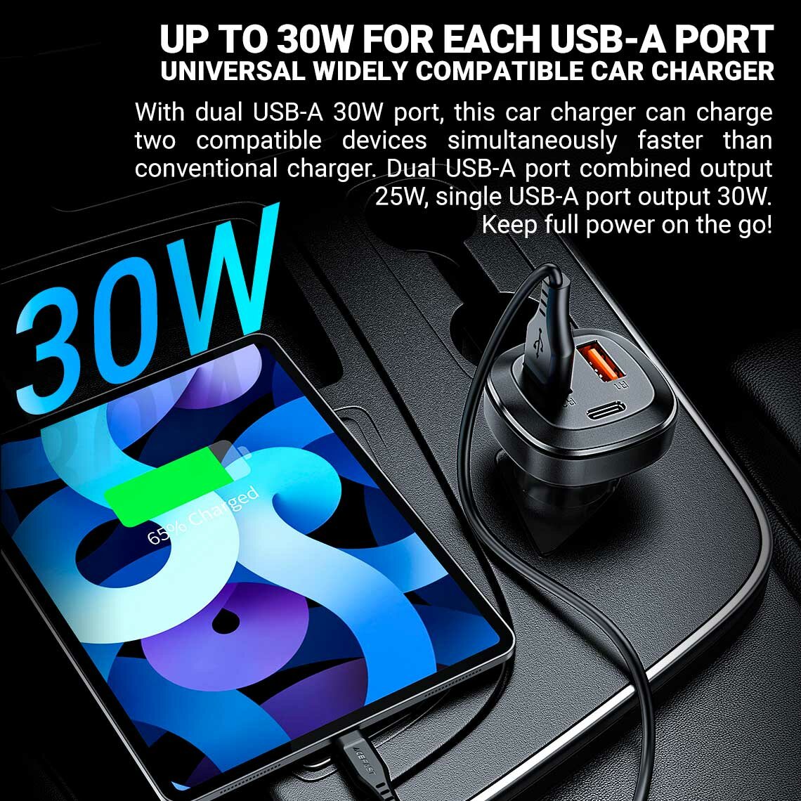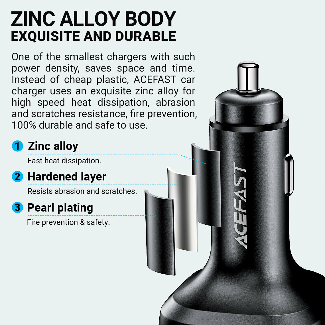 ACEFAST B9 66W 2USB-A+USB-C three port metal car charger - Black
