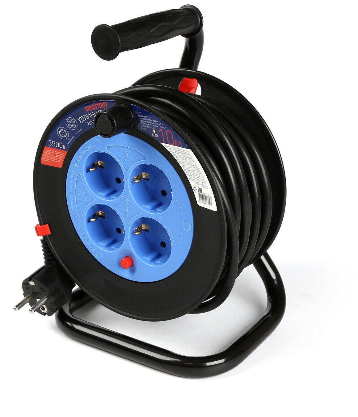 Купить Удлинитель Smartbuy на катушке, 4 гнезда 10 м, с заземлением и предохранителем ПВС 3*1,5 16А/3,5кВт