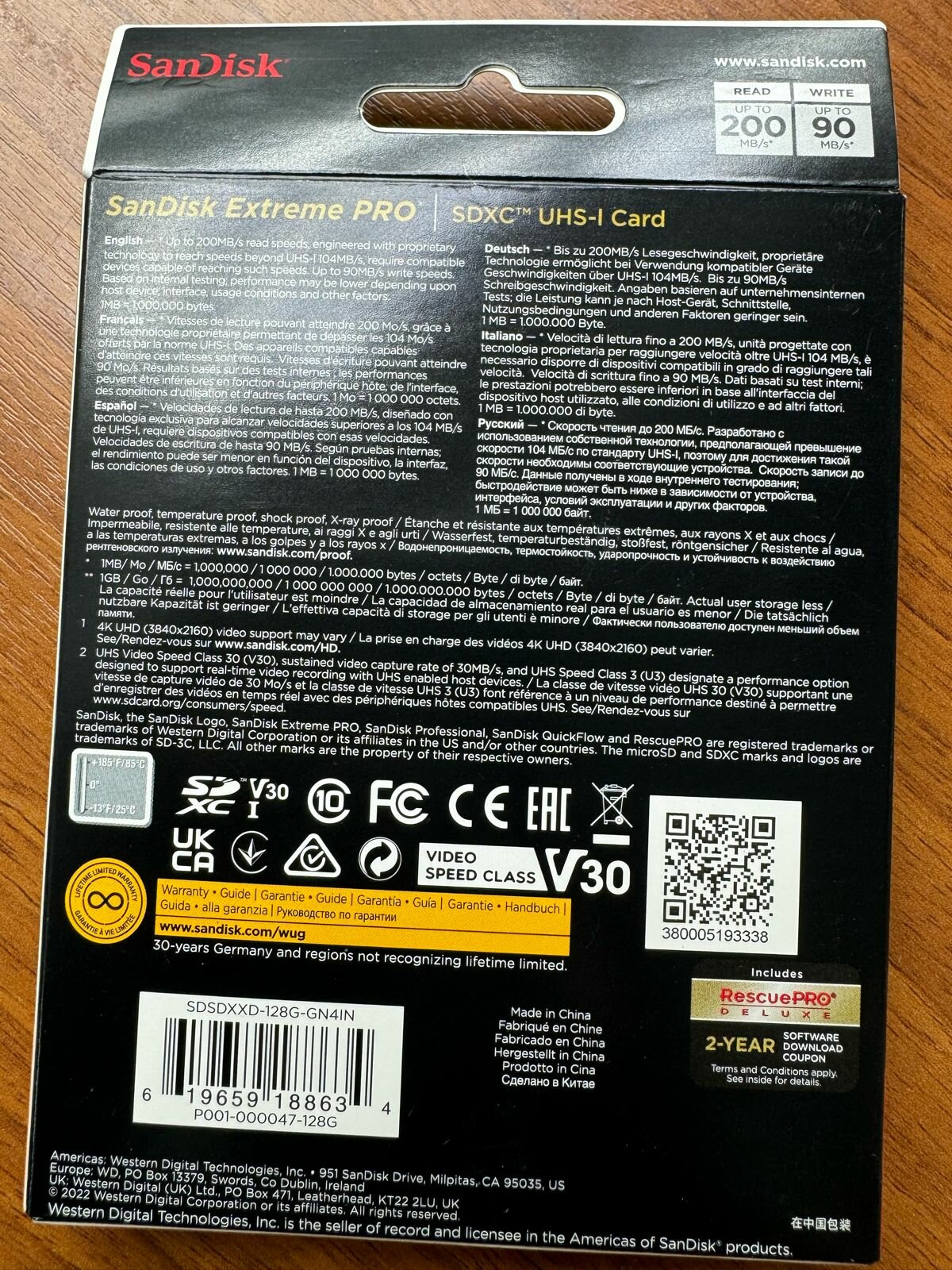 Карта памяти SanDisk SDXC Extreme Pro Class 10 UHS-I V30 U3 (200/90MB/s) 128GB