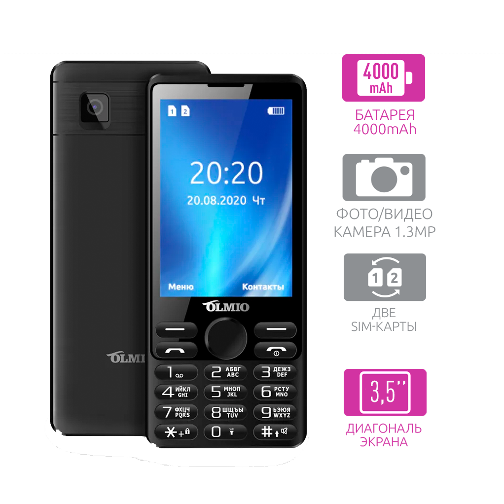 Кнопочный мобильный телефон с максимально большим дисплеем и аккумулятором, OLMIO E35