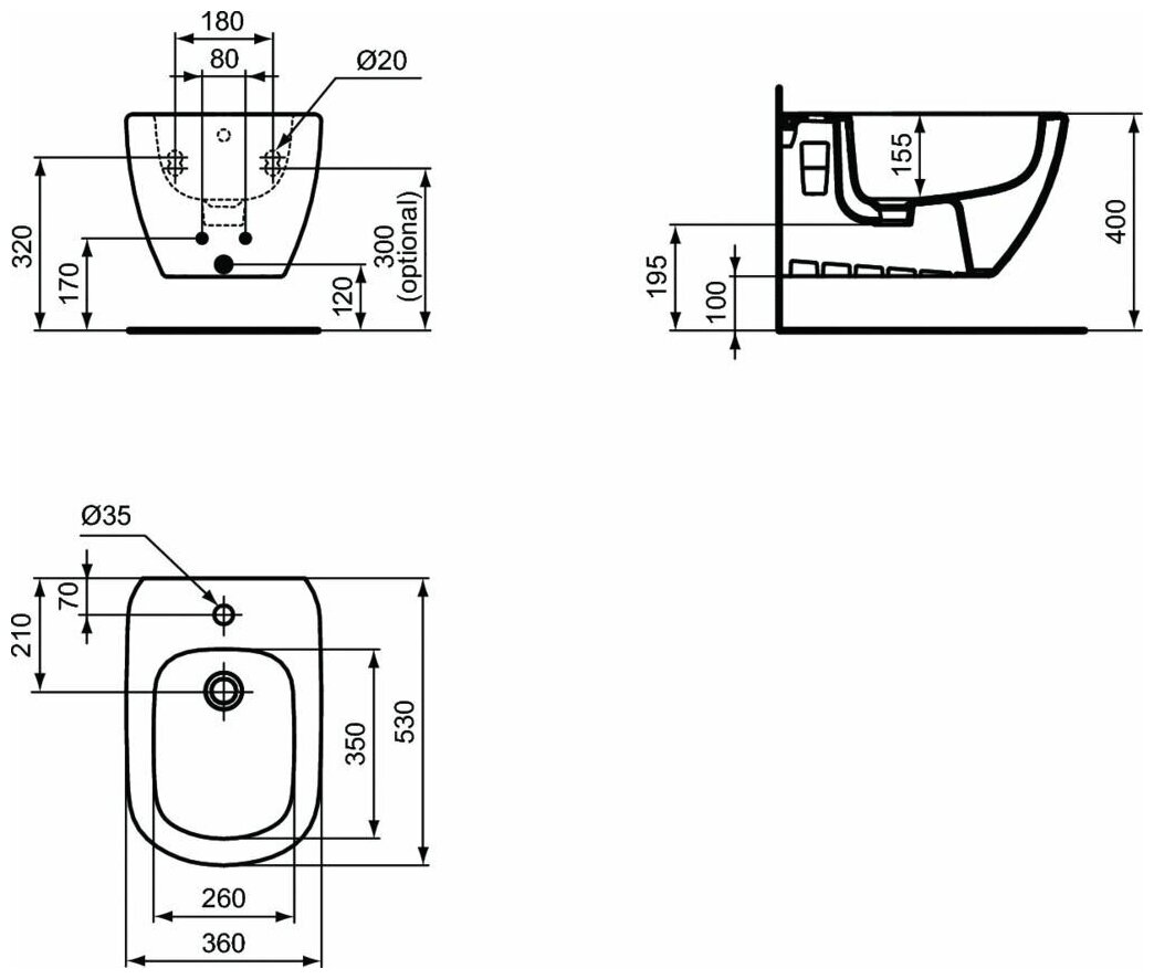 Биде подвесное, с отверстием под смеситель, с отверстием перелива, с крепежом IdealStandard Tesi T3552V1
