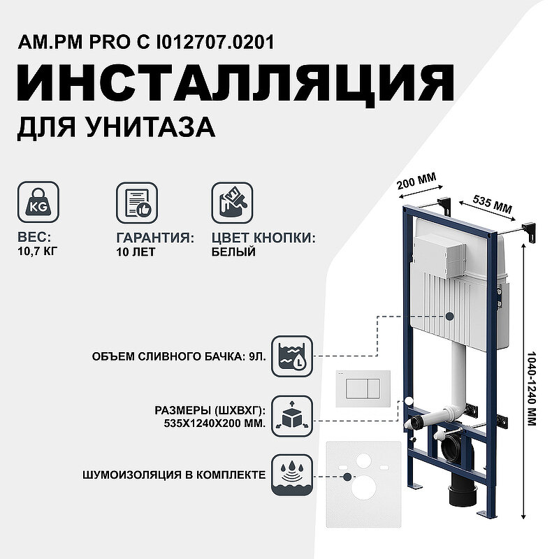 Инсталляция AM.PM ProC S I012707.0201 комплект 4 в 1: инсталляция для унитаза, механическая кнопка ProC S глянцевый белый, шумоизоляция, крепления