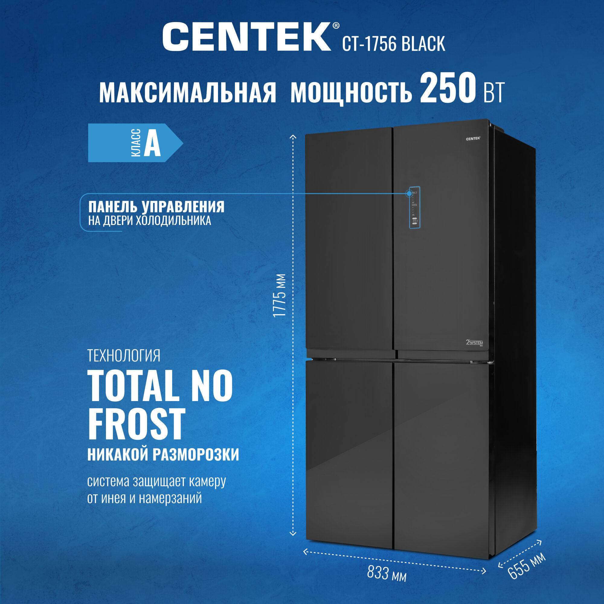 Холодильник четырехдверный Centek CT-1756 Black Glass Total NF, Side-by-Side, 442л (153л/289л), cтекло, с распашными дверями
