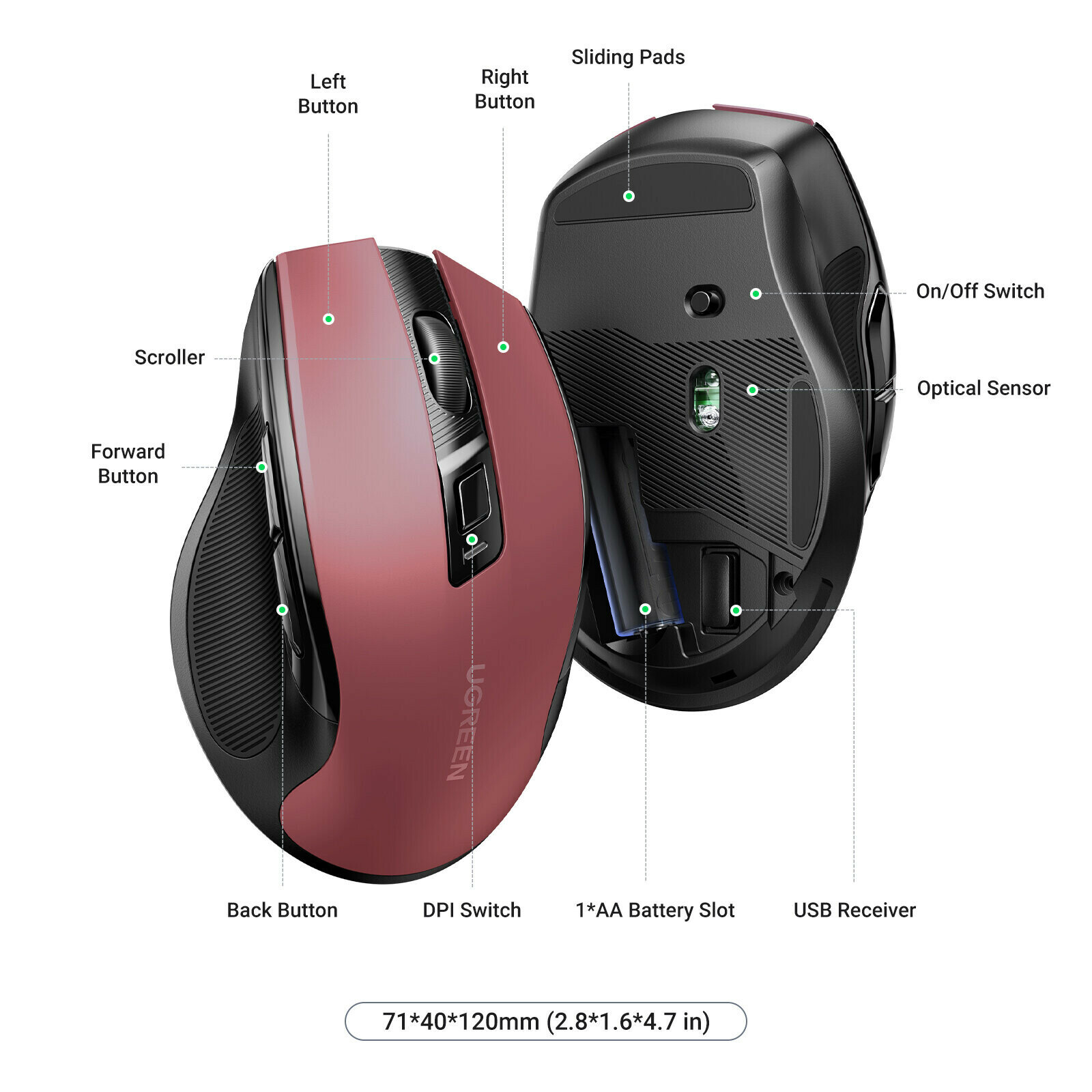 Беспроводная компьютерная мышь UGREEN MU006 Ergonomic Wireless Mouse 2.4G 4000DPI Silence Design 2.4 GHz/BT. Цвет: красный