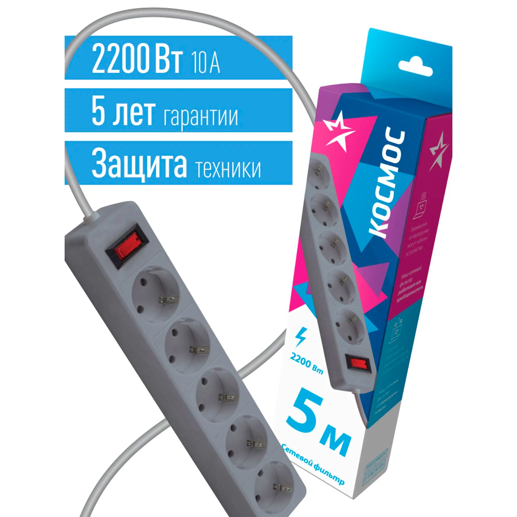 Сетевой фильтр Космос FKsm 5 розеток с заземлением 3x0.75 мм 5 м 2200 Вт цвет серый