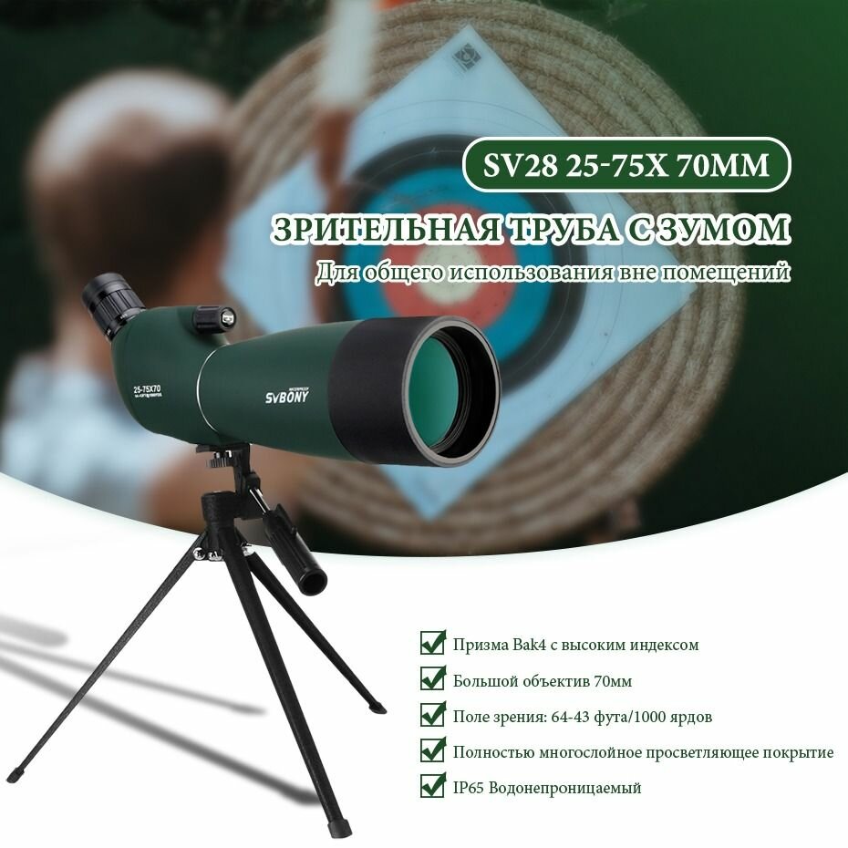 Зрительная труба / подзорная труба SVBONY SV28 25-75х70, увеличение фактическое до 25 крат, штатив
