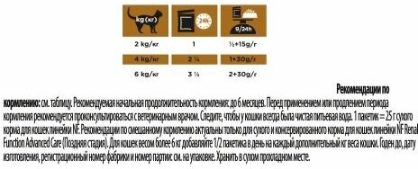 | Дозировка | Рекомендуемая начальная продолжительность кормления: до 6 месяцев. Перед применением или продлением периода кормления рекомендуется проконсультироваться с ветеринарным врачом. Следите, чтобы у кошки всегда была чистая питьевая вода. 1 пакетик = 25 г сухого корма для кошек линейки NF. Рекомендации по смешанному кормлению актуальны только для сухого и консервированного корма для кошек линейки NF Renal Function Advanced Care (Поздняя стадия). Для кошек весом более 6 кг добавляйте 1/2 пакетика в день на каждый дополнительный кг веса кошки. |