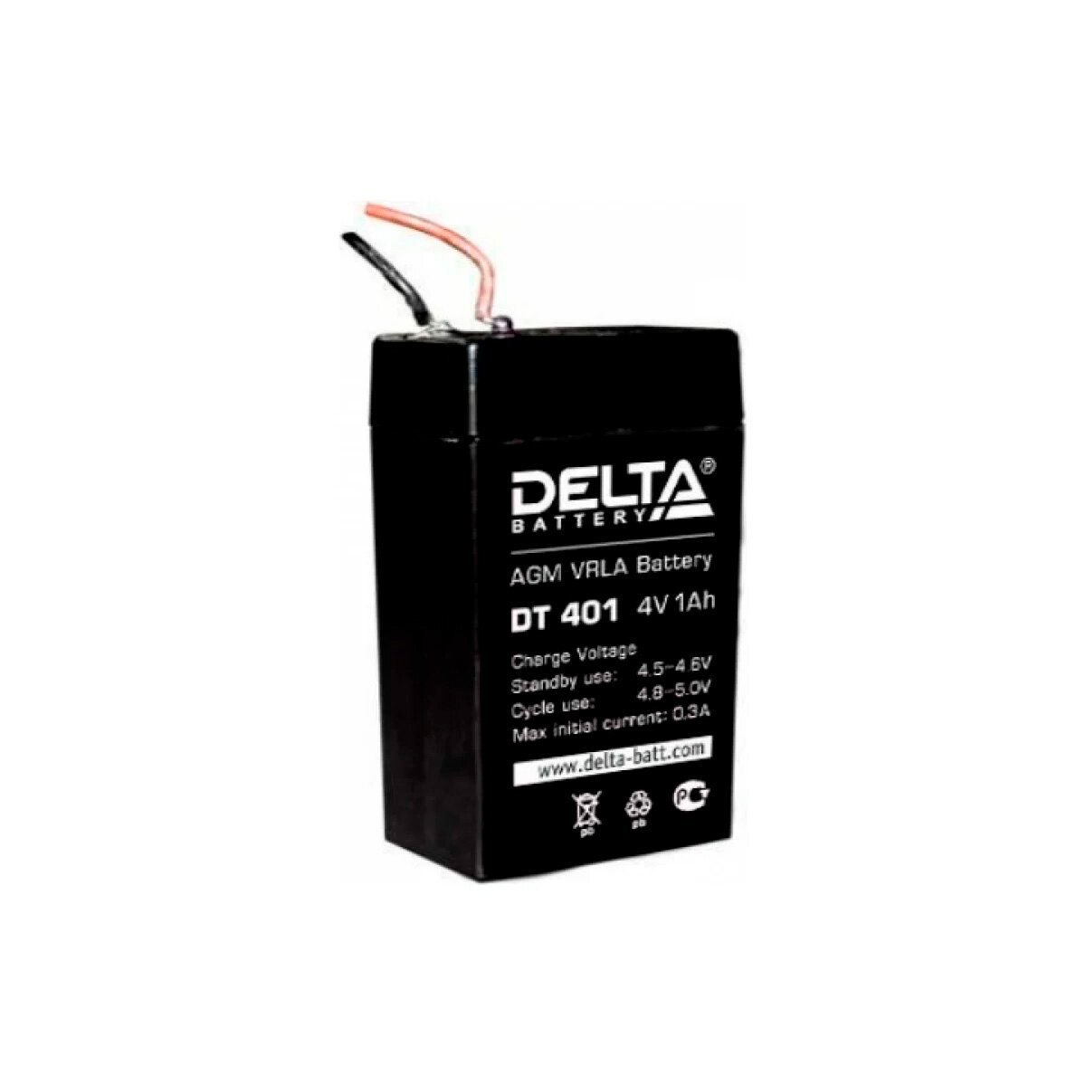 | Дополнительная информация | Аккумулятор Delta DT 401 полностью герметизирован, утечка из него электролита (кислоты) невозможна. Поэтому его можно транспортировать и использовать в любом удобном положении (вертикальном или горизонтальном). У батареи DT 401 отсутствуют ограничения на перевозку по автомобильным дорогам, по воздуху, по морю и по железной дороге |