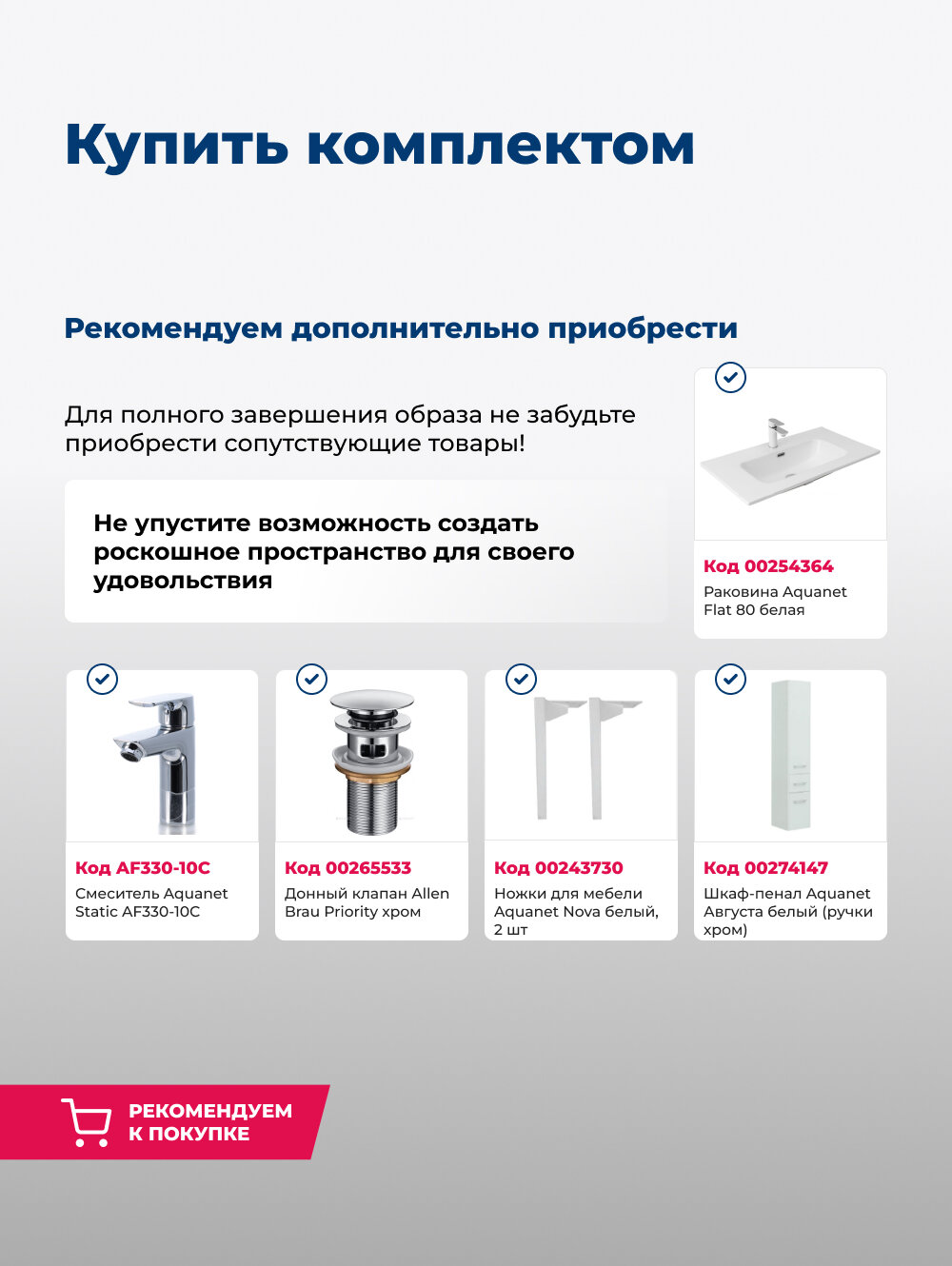 | Комплектация | Тумба Августа 80 (Flat) цв.белый глянец (277508), раковина в комплект не входит |