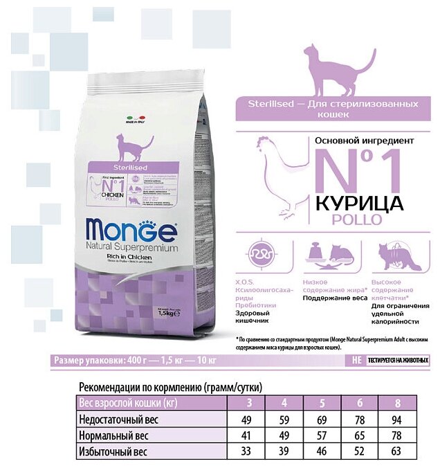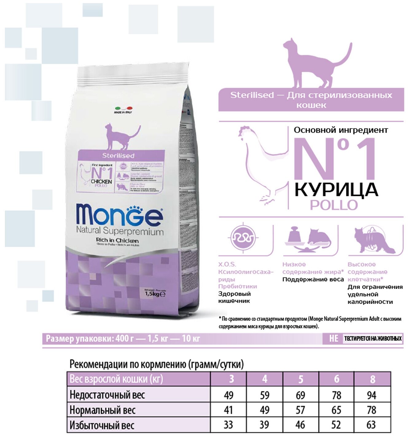 Ниже Вы можете прочитать отзывы на Сухой корм для кошек Monge Sterilised стерилизованных, с курицей, 1,5 кг, ознакомится с подробными характеристиками, посмотреть интересные обзоры и фотографии на Сухой корм для кошек Monge Sterilised стерилизованных, с курицей, 1,5 кг.