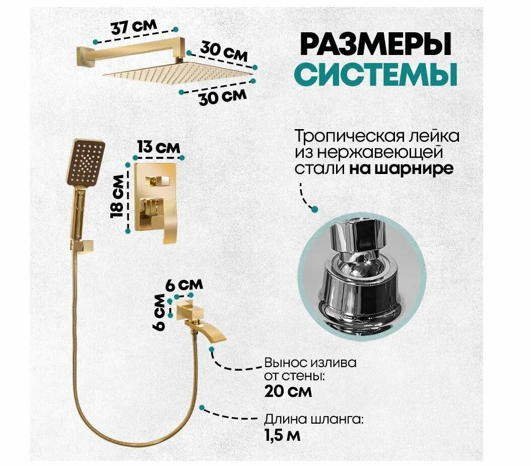 | Отзыв: | Дизайн системы впечатляет сразу. Идеально вписалась в мою ванную комнату. 4 режима работы, самый любимый - "тропический дождь". Изготовлена из латуни и нержавеющей стали, а значит и проживет подольше). Несколько месяцев используем и только положительные эмоции. |