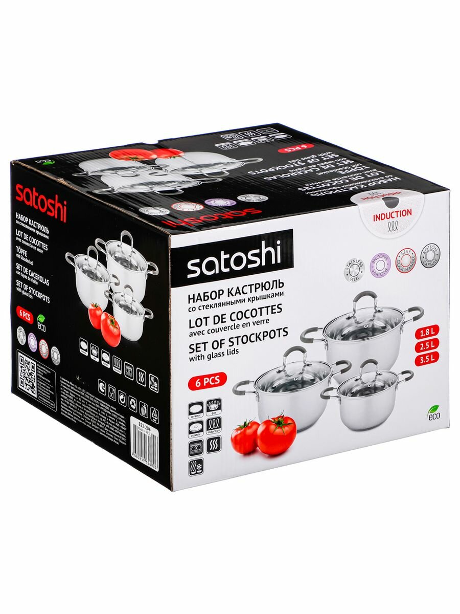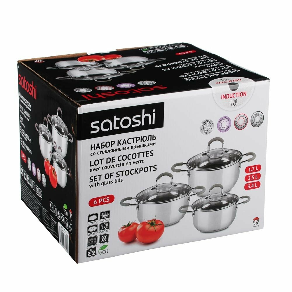Набор кастрюль Satoshi Альбер: 1,7 л, 2,5 л, 3,4 л со стеклянными крышками, нержавеющая сталь, индукция