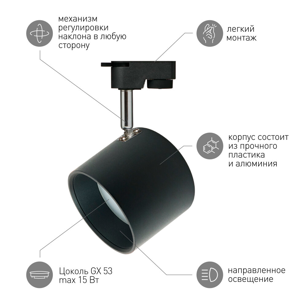 Светильник на трек однофазный 15Вт GX53 черный/серебро поворотный ЭРА