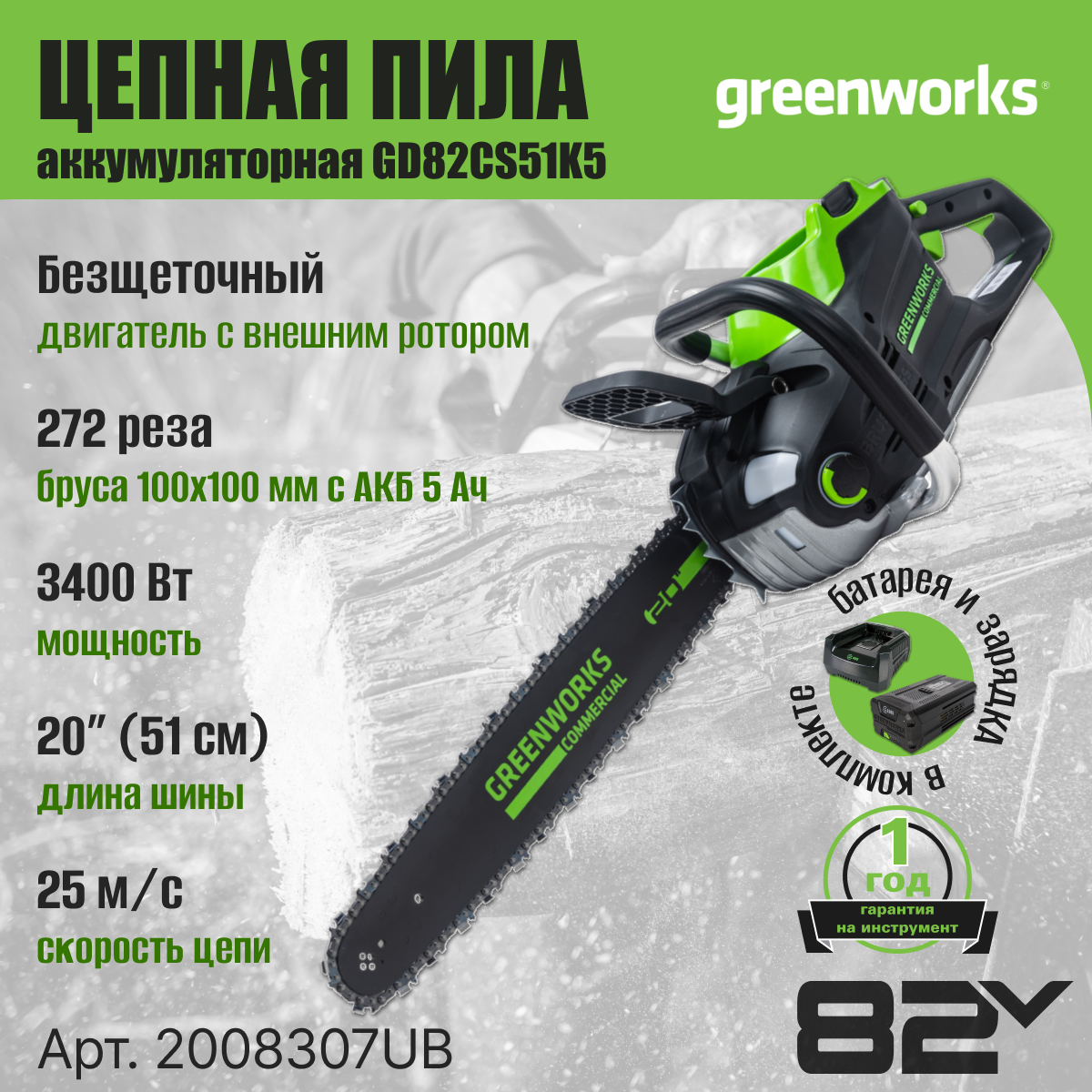 Цепная пила аккумуляторная Greenworks Арт. 2008307UB, 82V, 51 см, бесщеточная, с 1хАКБ 5 Ач. и ЗУ
