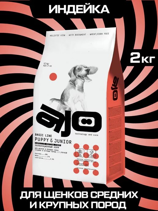 Сухой корм AJO Dog PUPPY & JUNIOR с гречкой, для щенков и молодых собак средних и крупных пород, индейка, 2 кг